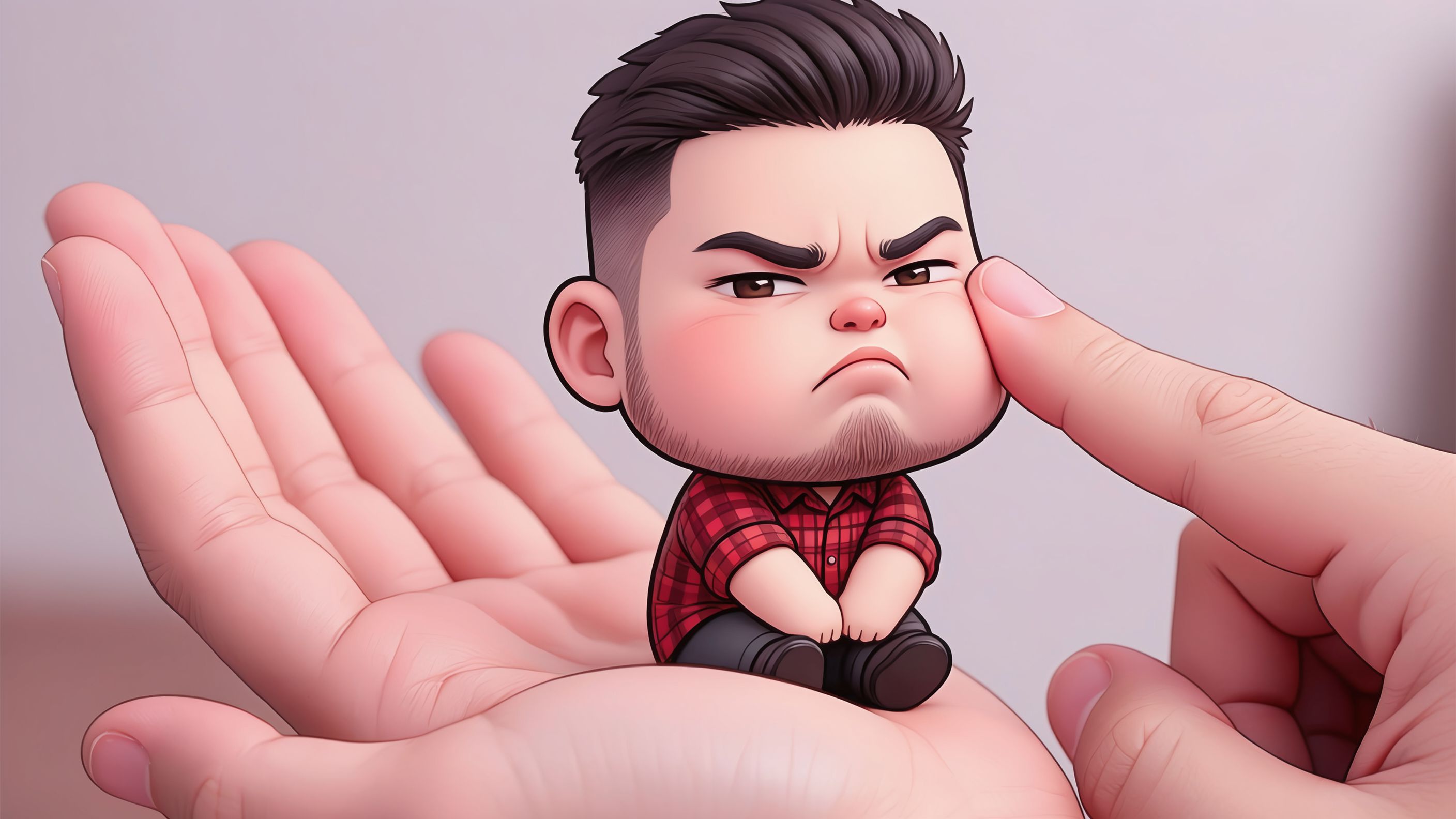 “Crea una versión chibi del personaje de las imágenes subidas, con la cabeza grande y el cuerpo pequeño, sentado sobre la palma izquierda abierta para dar una escala realista. La mano derecha le acaricia suavemente la mejilla con el dedo índice. El personaje parece molesto y enfadado: mejillas hinchadas, ceño ligeramente fruncido y ojos entrecerrados. Estilo chibi ultradetallado, colores pastel suaves, textura suave, iluminación limpia, poca profundidad de campo, gran énfasis en la expresión facial y la interacción de las manos, composición vertical con relación de aspecto 4:5.”